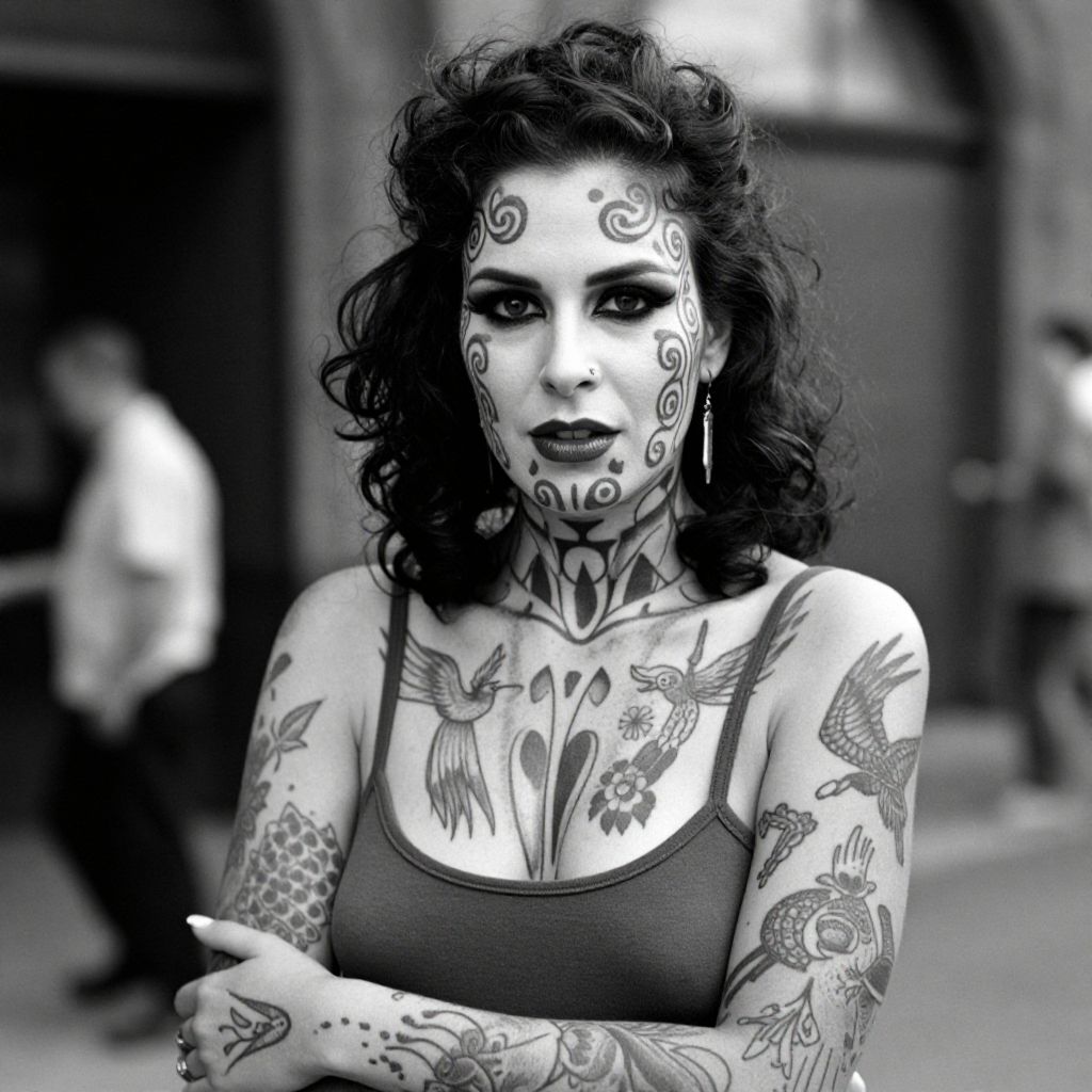 Black-and-white photograph of a tattooed woman with curly hair, dark makeup, and intricate facial and arm tattoos, wearing a tank top. Blurred