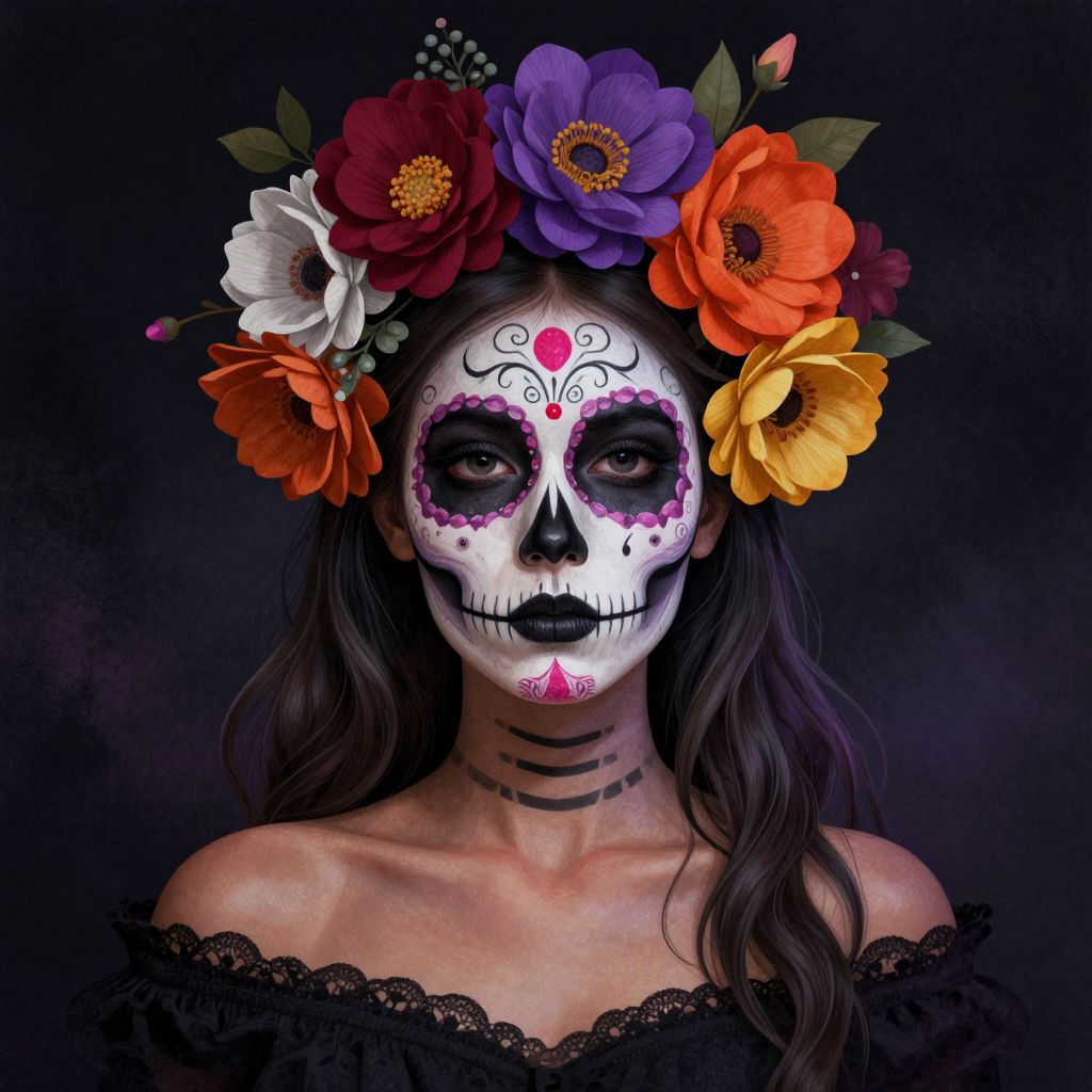 A beautifully detailed digital drawing of a young woman with intricate skull makeup, adorned with colorful flowers, set against a dark, moody background.