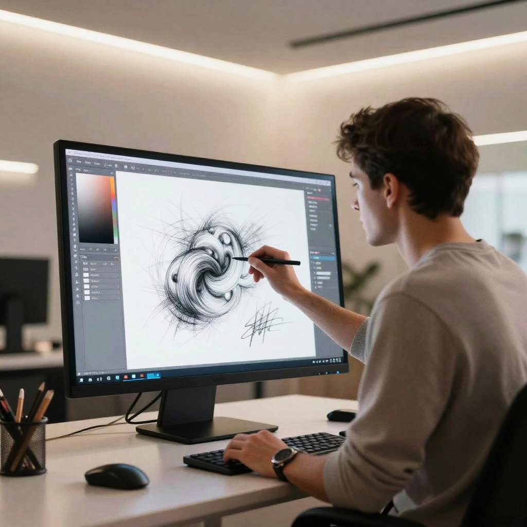 Ai draw tool in a sleek modern studio, digital artist interacting with a floating holographic screen showing dynamic sketches, smart AI suggestions displayed, soft ambient lighting with a futuristic minimalist design, high detail