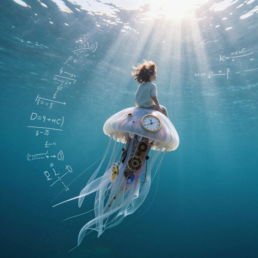 A child sits atop a fantastical, clockwork jellyfish, gliding through a serene, glassy ocean bathed in ethereal sunlight, as delicate trails of equations float and dissolve around them, creating a dreamlike, surreal underwater scene rendered in high-definition digital art.
