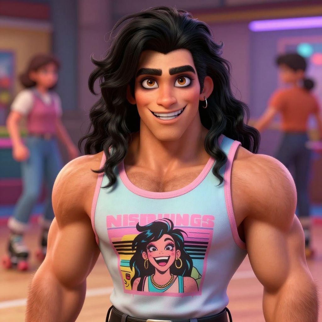 This is a vibrant, digital CGI image of a muscular, tan-skinned man with long, wavy black hair and thick eyebrows, smiling confidently. He wears a white tank top with a colorful graphic of a smiling woman with black hair, labeled "DISCO QUEEN." His biceps are prominently showcased. The background is blurred, featuring two other people, a woman in a pink top and another in an orange top, skating in a retro-styled, neon-lit room. The overall style is reminiscent of 1980s pop culture, with bright colors and a nostalgic feel.