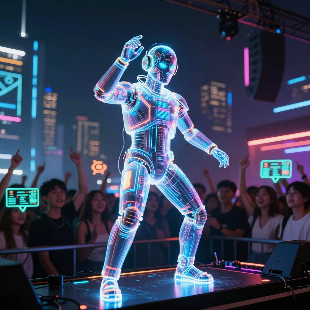 Futuristic DJ role model hologram performing at a high-tech concert, glowing neon panels, energetic crowd with augmented reality effects, cyberpunk cityscape in background, vivid colors, ultra-modern scene, highly detailed sci-fi art.