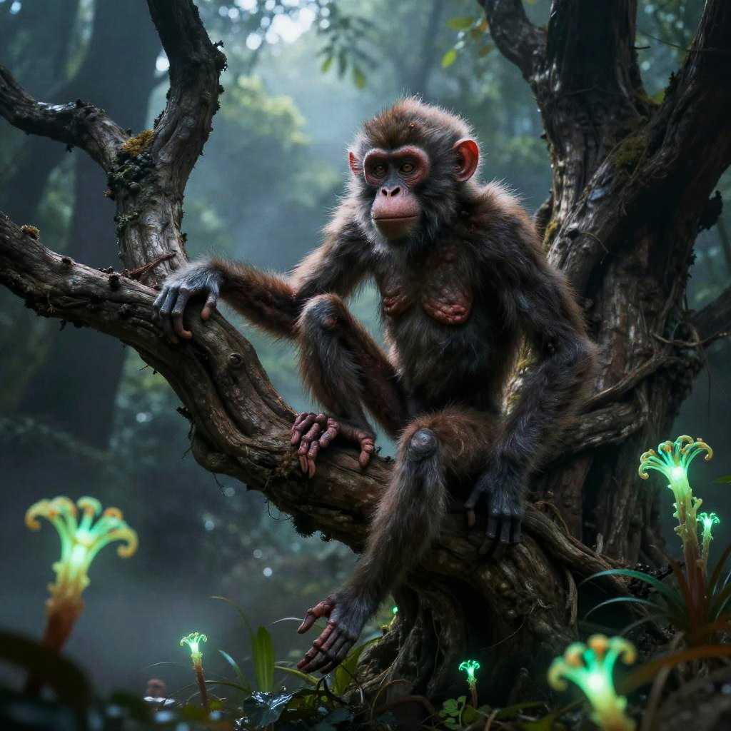 A deformed monkey wandering through a mist-laden swamp, distorted proportions including elongated fingers and a misshapen face, textured with vivid green moss and swamp elements, atmospheric twilight colors, painterly style with intricate details