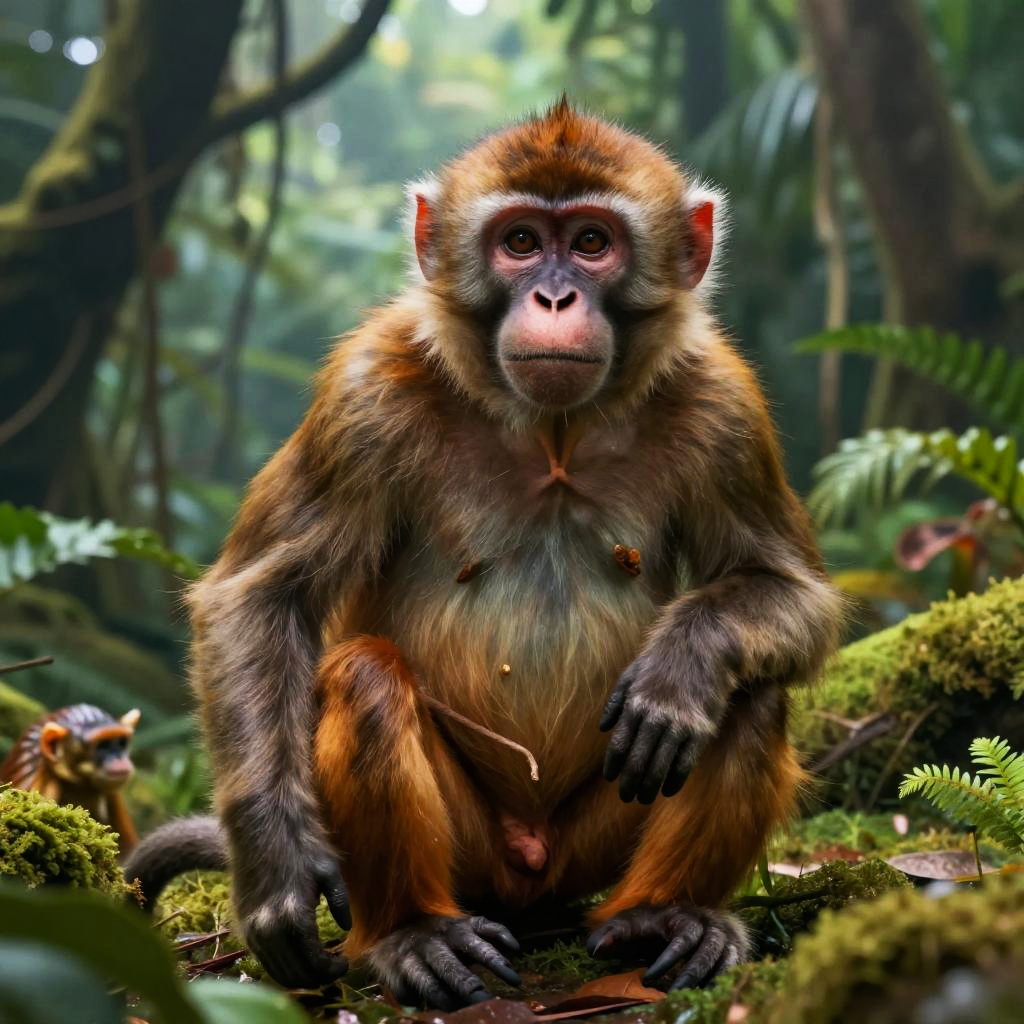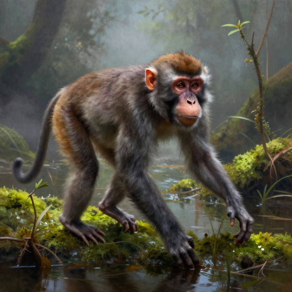 Digital painting of a young monkey with brown fur and reddish face, walking across a mossy, reflective forest stream.