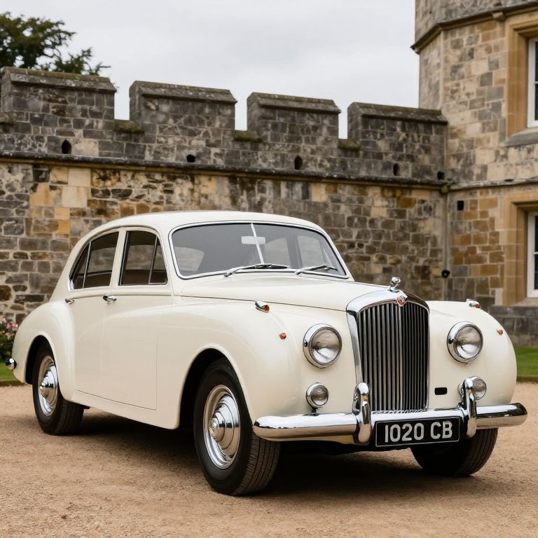 Classic 1962 Bentley S2 showcased in pristine cream livery, featuring a polished chrome grille, distinctive round headlights, and a license plate reading \"1020 CB,\" parked gracefully before a historic stone wall under an overcast sky.