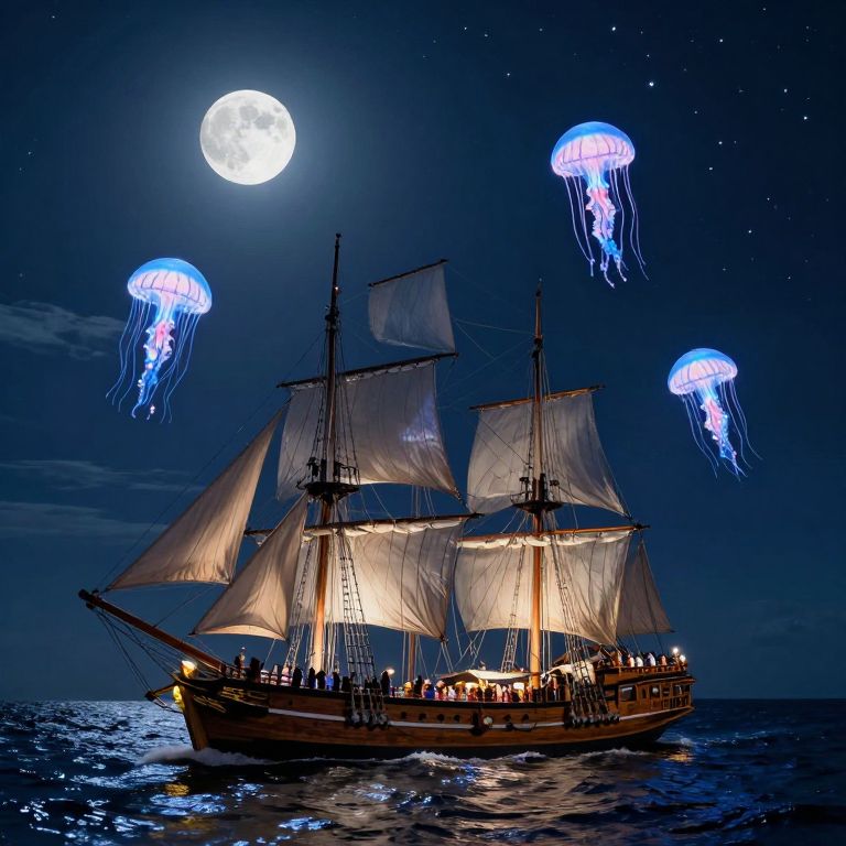 Photograph of a illuminated wooden ship with white sails at night, surrounded by glowing blue jellyfish under a full moon.