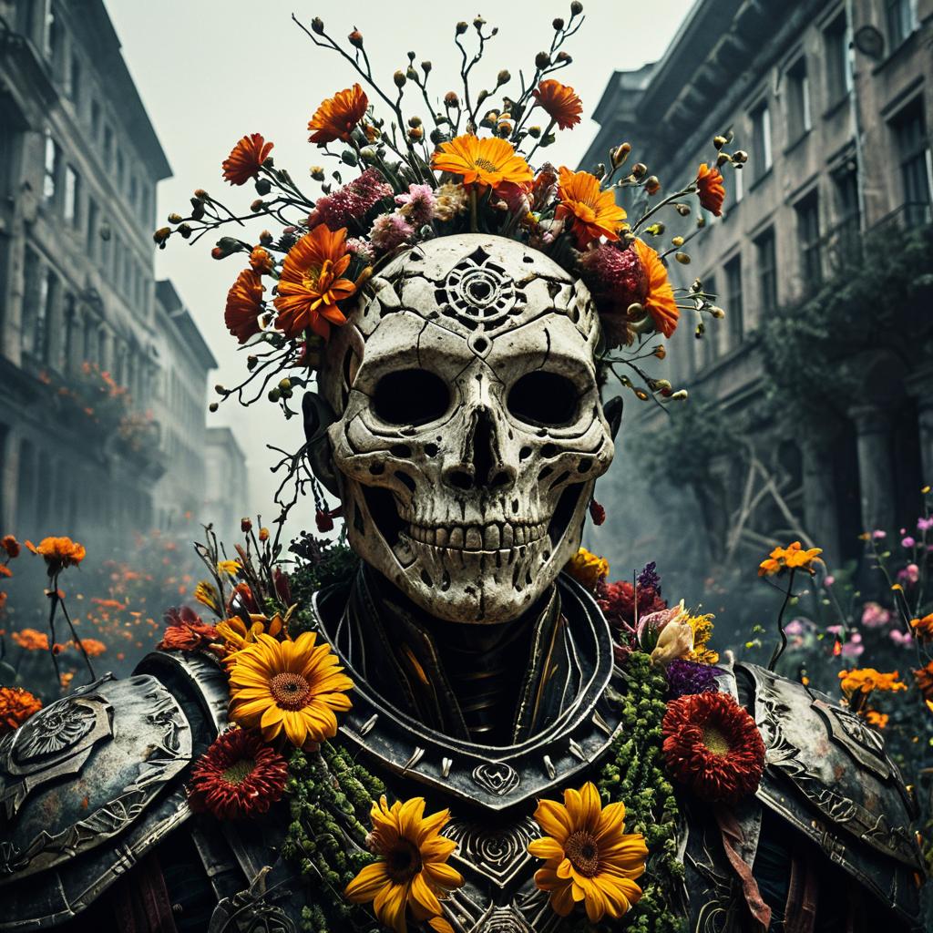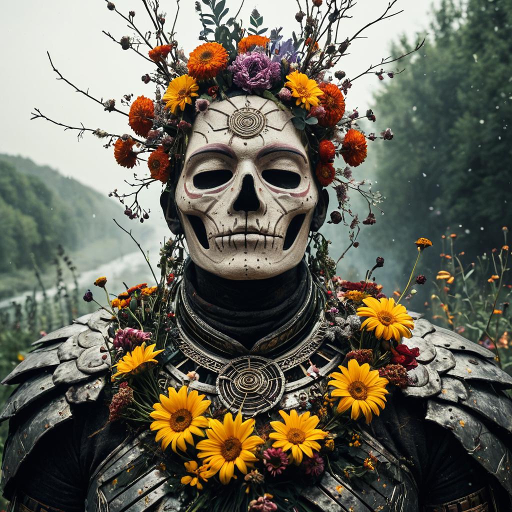 A photorealistic image of a warrior wearing detailed, ornate armor and a skull mask adorned with a crown of vibrant flowers. The figure holds bright yellow flowers amid a misty, forested background filled with scattered flowers. The atmosphere combines elements of mystery and fantasy, evoking a mythical, nature-linked spirit.