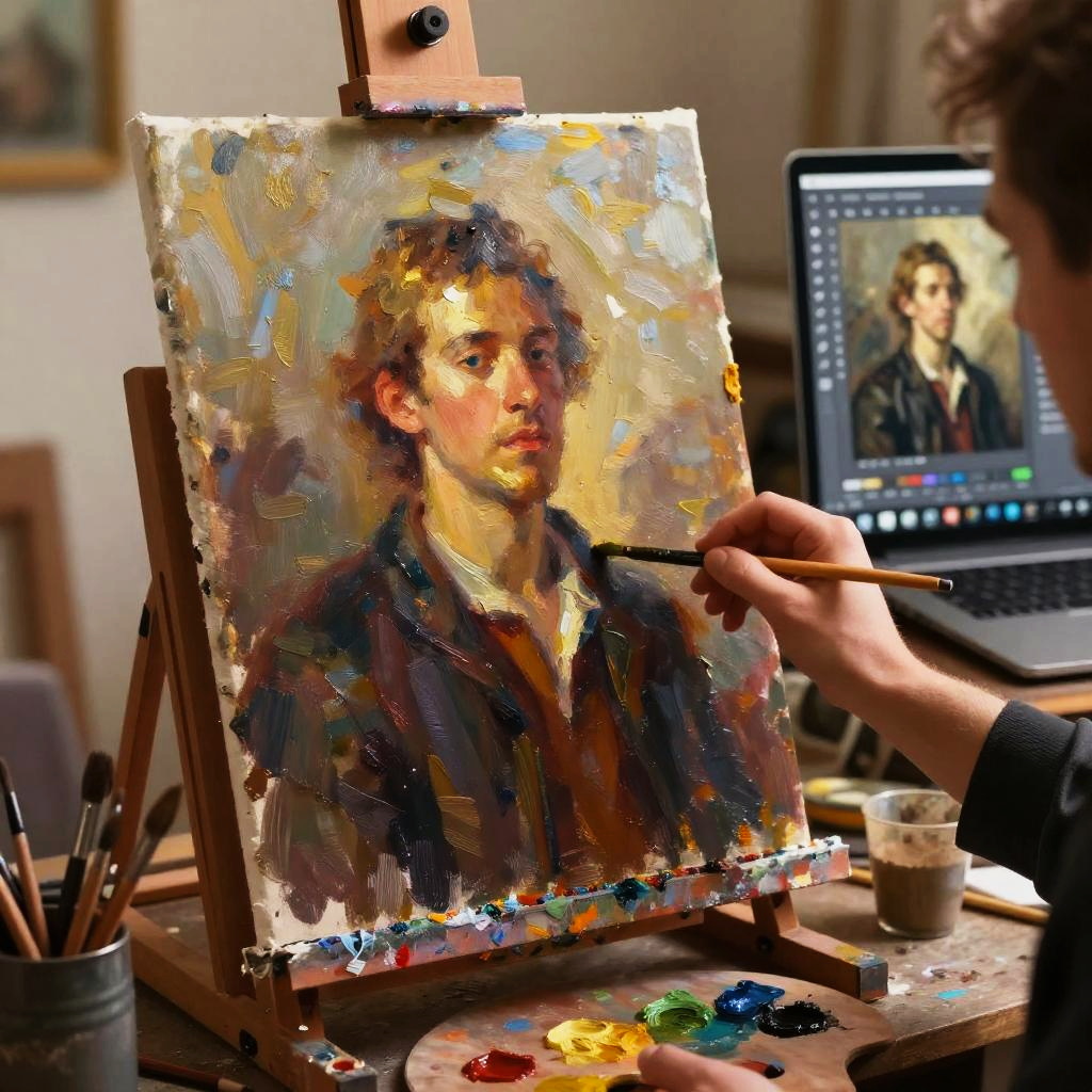 Oil painting from photo online, a digital workspace showing an artist’s hand transforming a vibrant photo into a classic oil painting style, rich textures, bold brushstrokes, warm golden lighting, cozy studio setting with easel and palette.
