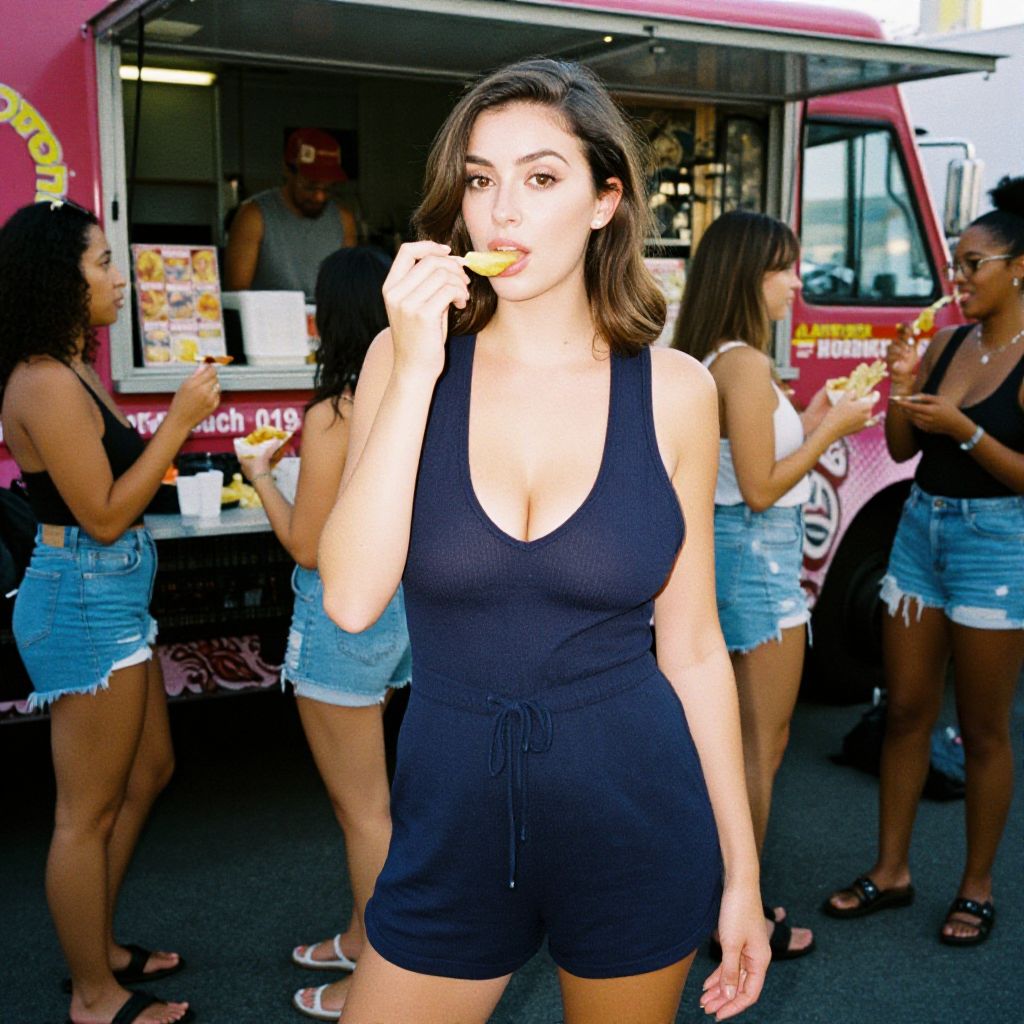 A lean woman in a casual summer sleeveless navy blue romper with a drawstring waist and black peep-toe sandals is enjoying a vibrant street food experience at New York Food Trucks, savoring delicious bites while chatting with friends. Visual style: 3M analog film stock. Sexy. Pretty face and beаutiful eyes. Big breasts