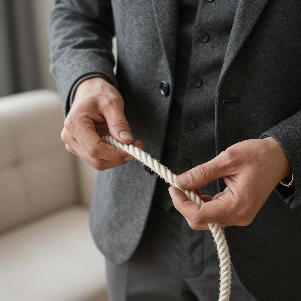 Photograph of a person's hands holding a white rope with a rough, ured end. The person wears a dark gray woolen suit, buttons visible on the vest. Background includes a beige, tufted sofa and dark curtains. The hands are slightly dirty and gripping the rope tightly. The person's fingers are spread and the rope is taut between the hands.