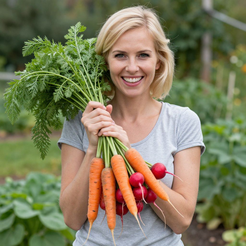 Blonde-haired woman smiling brightly while holding a bundle of freshly harvested orange carrots and vibrant red radishes, set against a lush green garden backdrop.