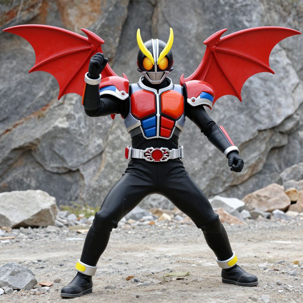 High fantasy kamen rider, 4k, vibrant colors, rock quarry location, glowing eyes, fantasy inspired dragon armor made out of pvc plastic, action scene, daytime, rubber suit,