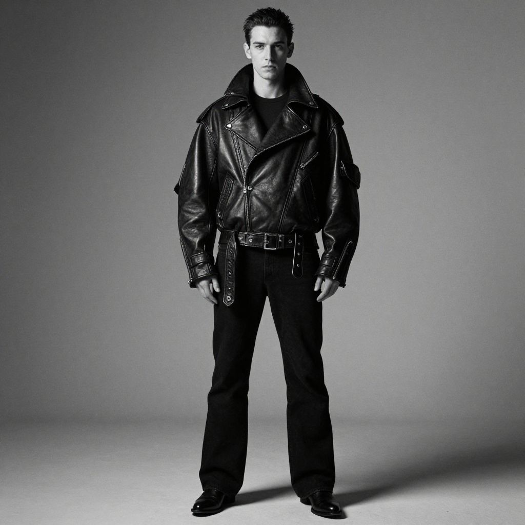 "Ink Permanence michel foucualt wearing a grotesque 1990s high fashion leather jacket and he looks like a balenciaga model, full body,"