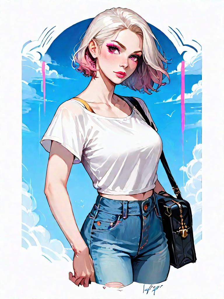 1girl, source_comics, realistic face, full body shot, Woman, casual, cropped beige top with scalloped hem, scoop neck, short sleeves, mid-rise blue denim jeans, fringed white leather shoulder bag.