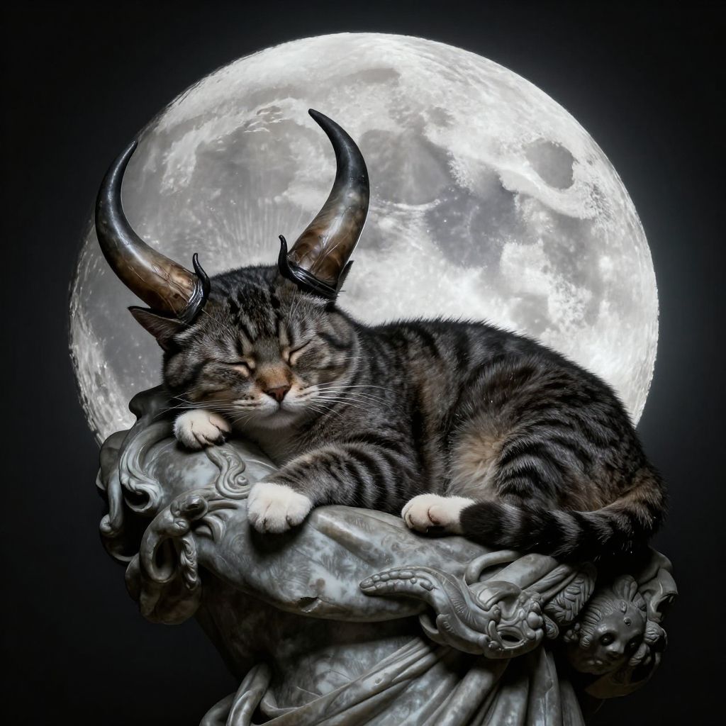 Photorealistic digital artwork depicting a tabby cat with large, dark, curved horns resting on an ornate, gray stone statue. The cat has closed eyes and white paws, draped over the statue's intricate, swirling details. Behind the cat, a large, bright full moon fills the background, creating a stark contrast with the dark, black backdrop. The cat's fur is detailed with black and brown stripes, and its horns are shiny and textured, adding a fantastical element to the otherwise realistic scene. The statue has a classical, almost gothic style.