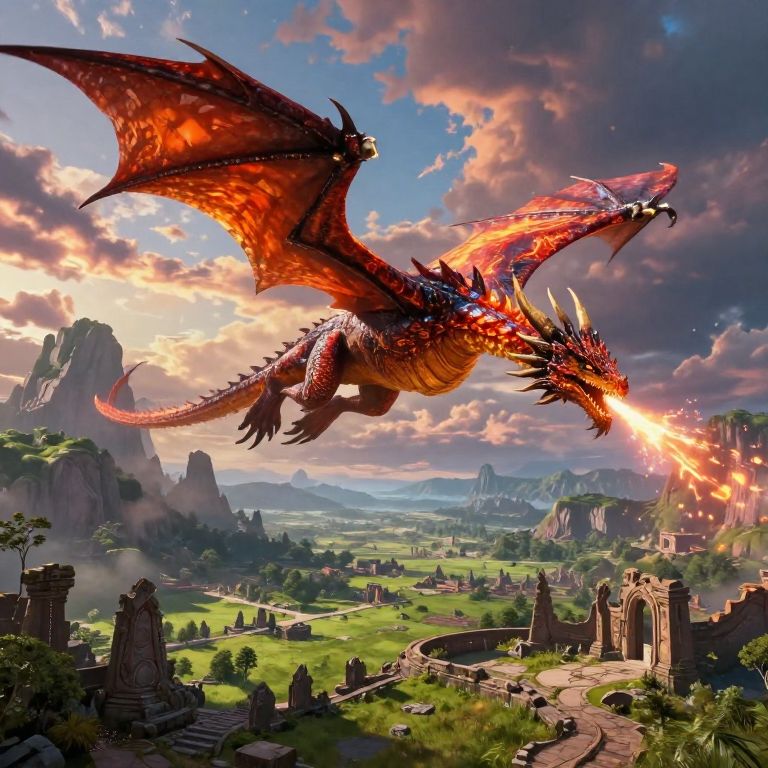 Golarian dragon soaring over a lush valley dotted with ruins, scales shimmering in fiery hues, breath emitting glowing embers, vast panoramic view with vibrant, dramatic skies and fantasy epic composition.