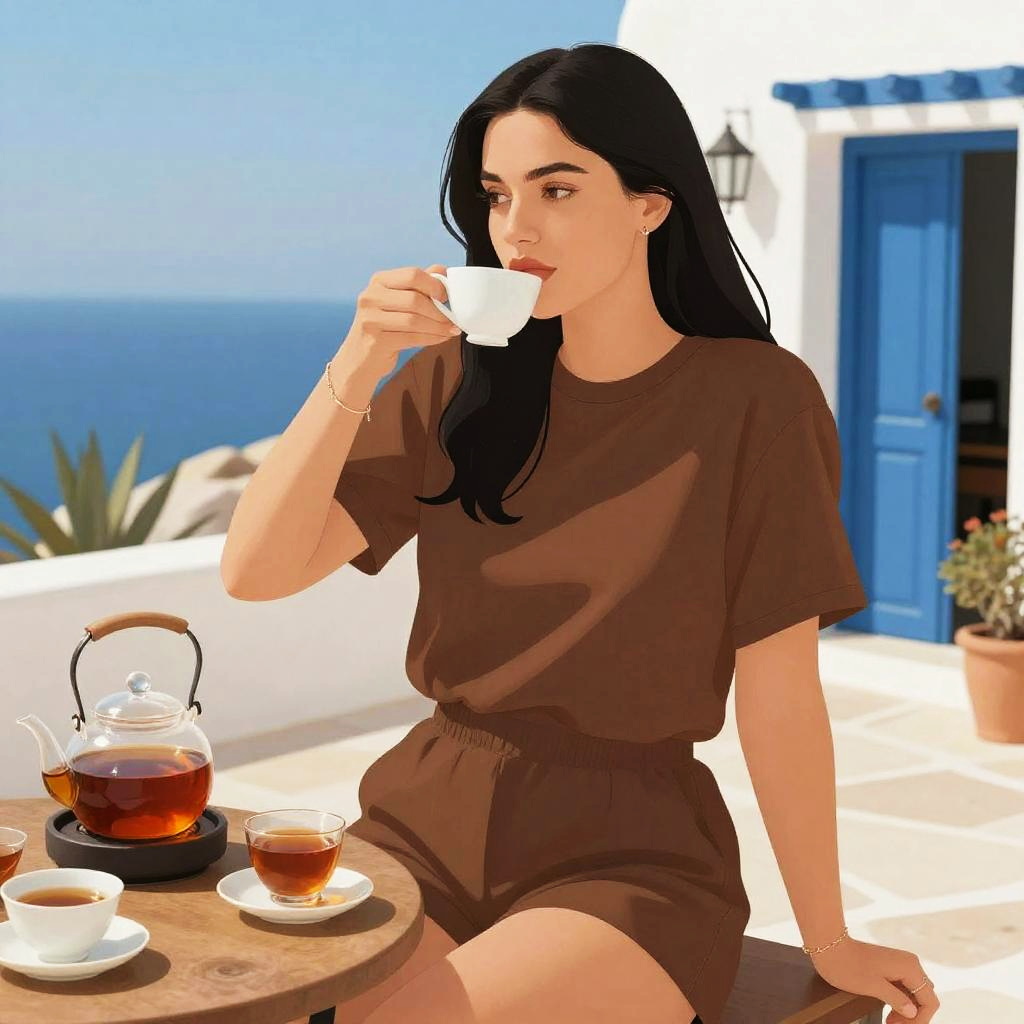 A lanky woman in casual streetwear, featuring a relaxed-fit brown t-shirt and matching brown shorts, minimal jewelry with a delicate bracelet, natural makeup, and straight long black hair, enjoying a refined tea service in a Mediterranean villa, illustrated in the style of Antarctic Press. Sexy. Pretty face and beutiful eyes