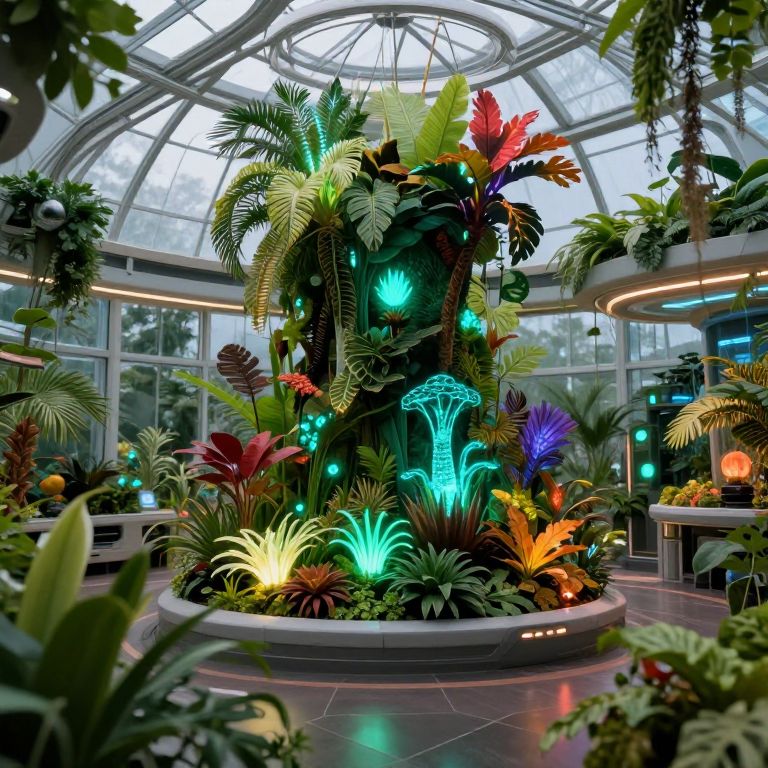 Genera diversity portrayed as a futuristic greenhouse filled with exotic plants from multiple genera, glowing under bioluminescent lights, sci-fi elements, clean high-tech environment, vivid colors with sharp contrasts, ultra detailed environment