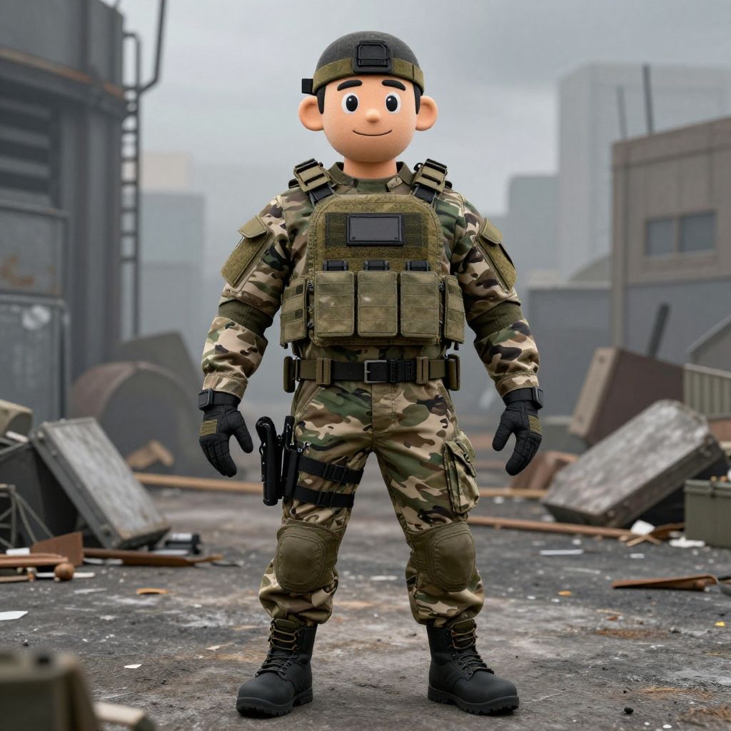 Cartoon-style soldier in camouflage uniform, tactical vest, and black gloves stands in a post-apocalyptic, urban, debris-filled background. CGI image.