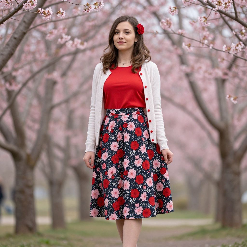 Full body portrait of a young woman standing outdoors under blooming pink cherry blossom trees. She is wearing a red top paired with a floral skirt featuring red and pink flowers on a dark background, complemented by a light-colored cardigan with red buttons and accents. The outfit is accessorized with a red flower hair clip. The background is softly blurred, highlighting the subject with a shallow depth of field.