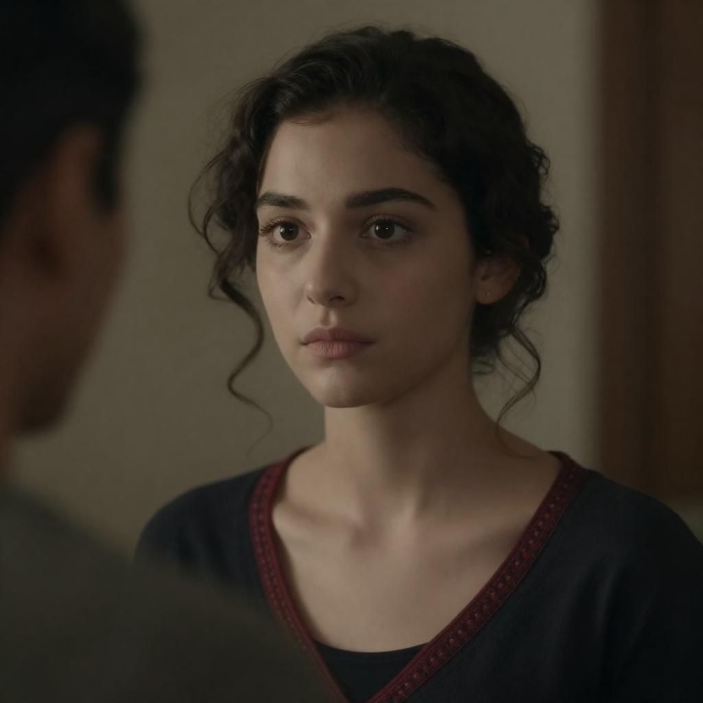Photograph of a young woman with light olive skin, dark brown wavy hair, and expressive brown eyes. She wears a gray hoodie, sitting in grass, looking directly at the camera with a slightly concerned expression. Partial view of a yellow-sleeved arm in the foreground.