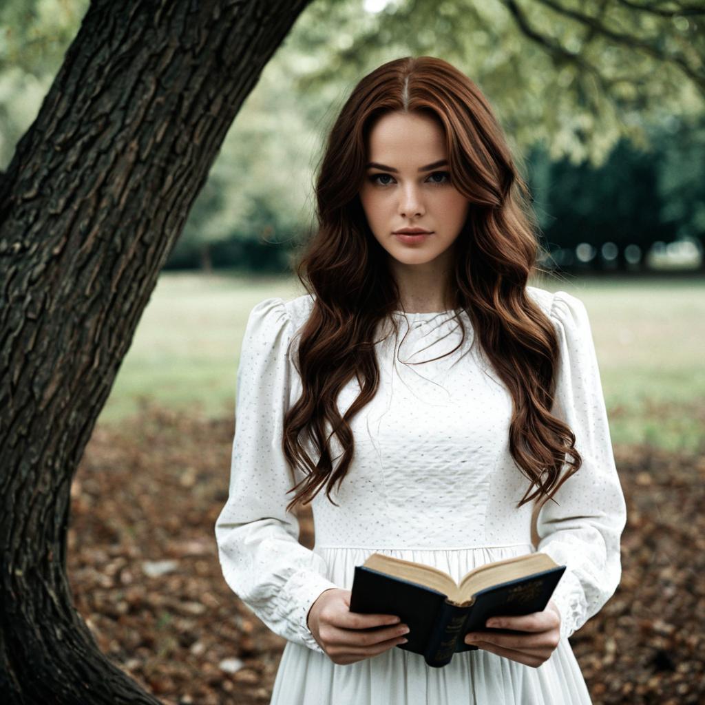 Bad man book costume,1girl, solo, long hair, tree, outdoors, book, holding, brown hair, long skirt, holding book, looking at viewer, nature, blue dress, forest, standing, dress