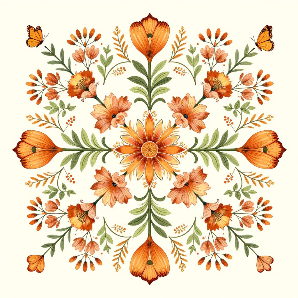 Digital floral mandala with vibrant orange poppies, green leaves, and small orange butterflies symmetrically arranged on a white background.