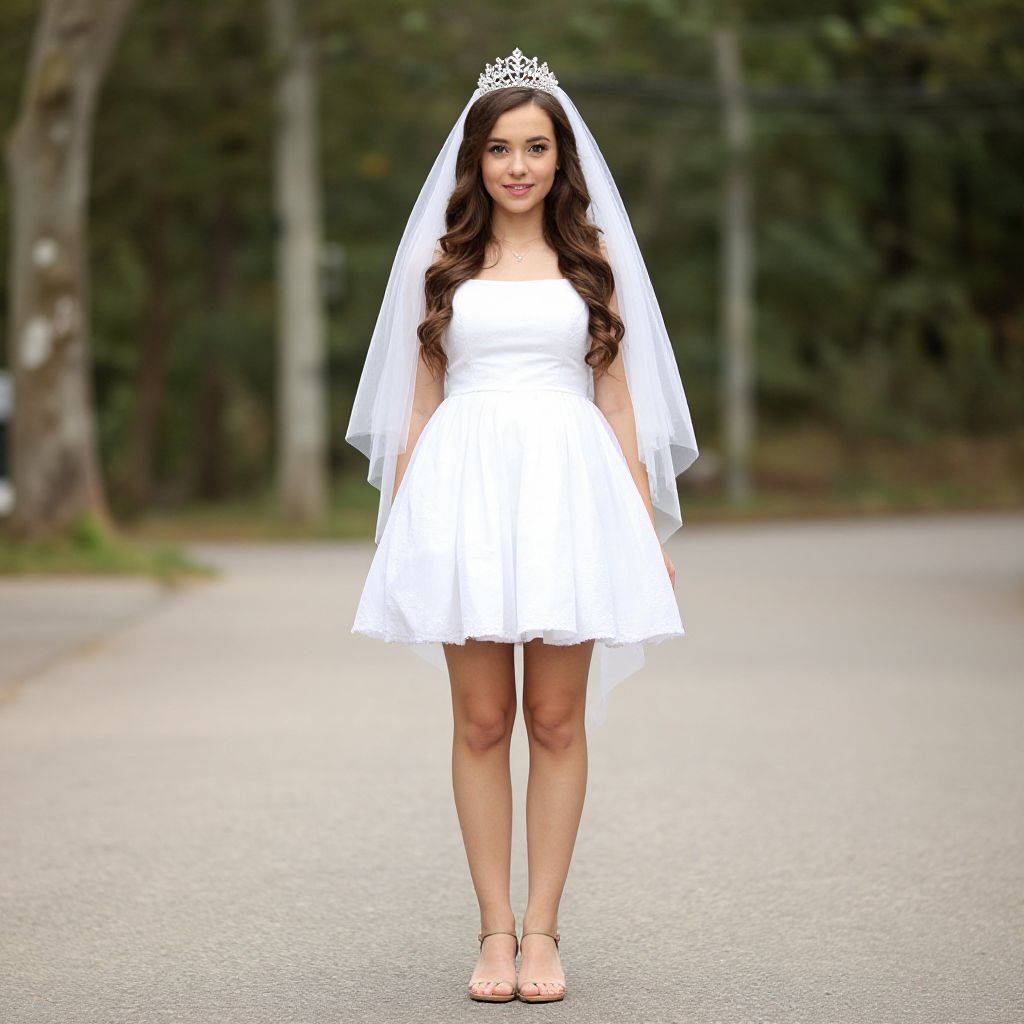 Bride stag costume, 1girl, solo, dress, brown hair, crown, long hair, sandals, white dress, veil, standing