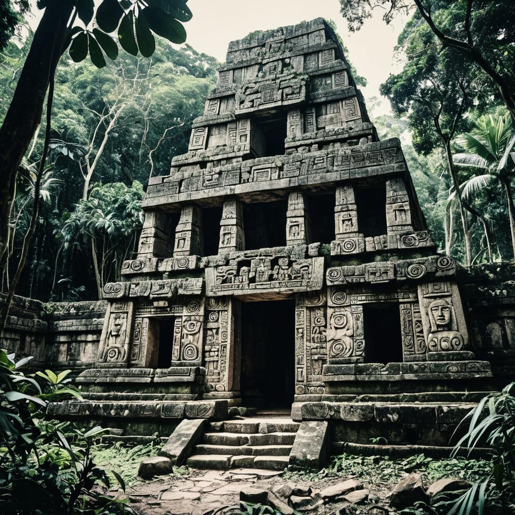 Pen the ancient Mayan temple, in the style of symbolic relief carving, dense jungle ruins, historical documentation, intertwining of vines and stone, mimicking ruined materials, Freya North, use of vintage imagery.