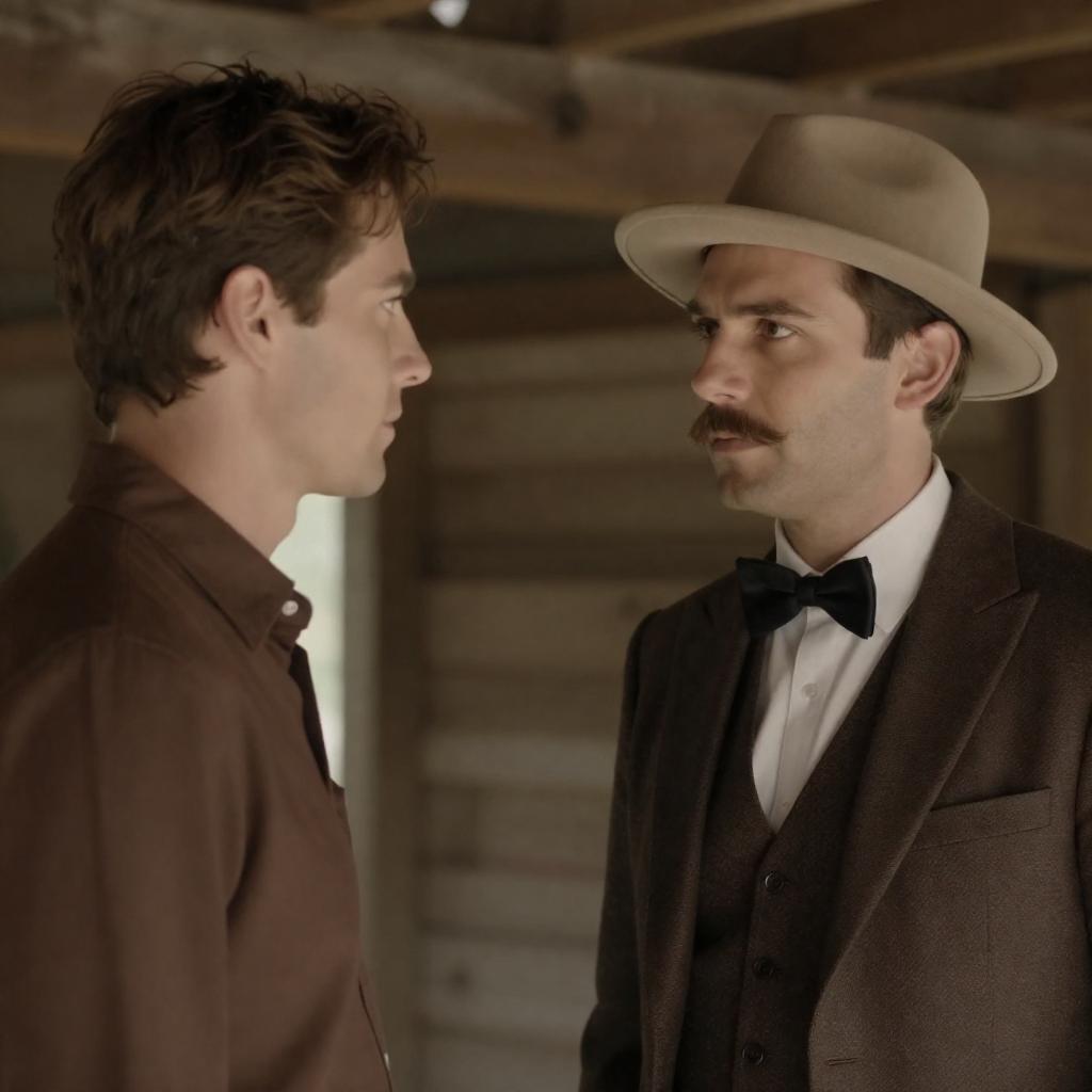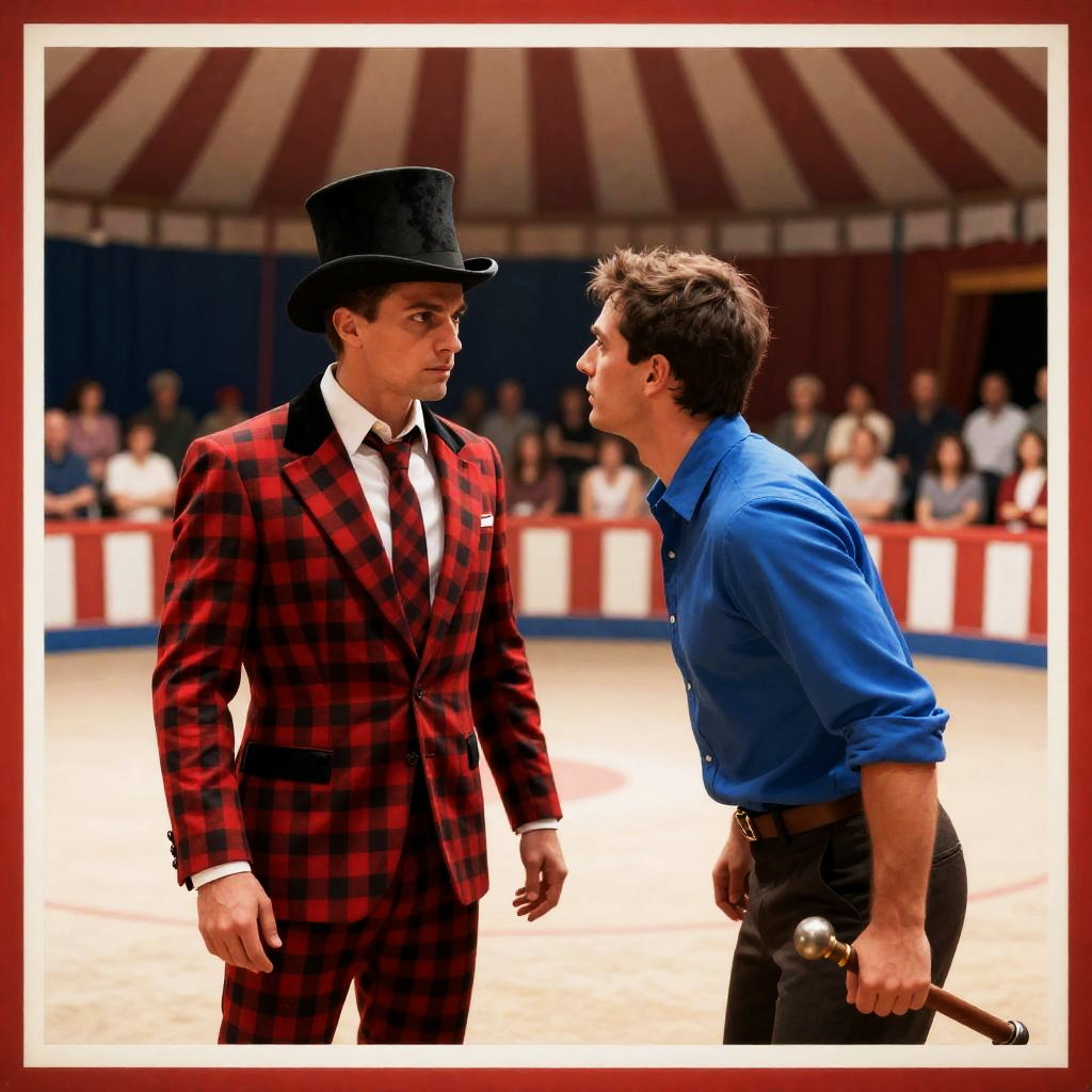 Photograph of a circus poster. Two performers: a man in a red checkered suit with a top hat, and a man in a blue shirt leaning towards him. Circus ring with audience and striped barrier in background. Both men have intense expressions. Number of people: 2 performers, many in background.