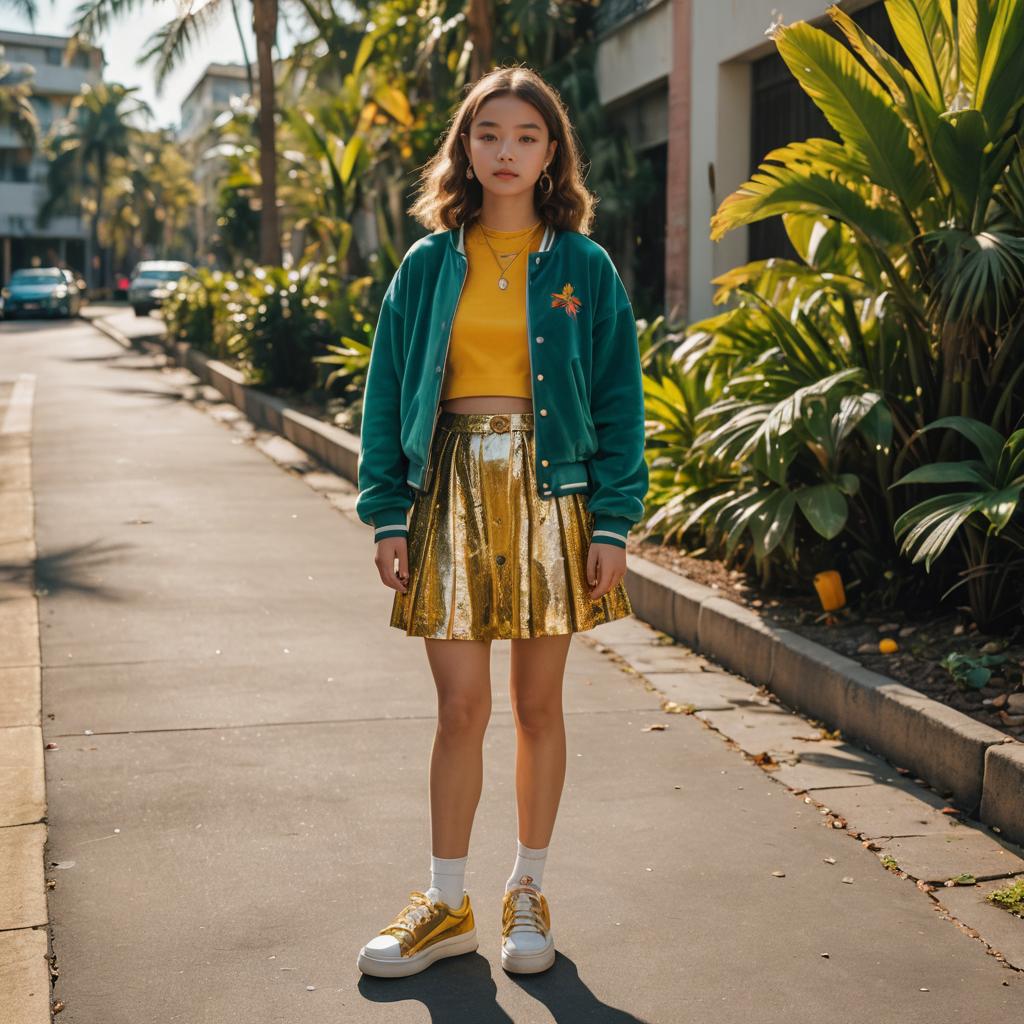 Trendy teenage fashion ideas, full-body, sunlit photograph showcasing a youthful street style ensemble. The subject is wearing a velour track jacket top and a velvet skater skirt. Accessories include a simple gold necklace and classic canvas high-top sneakers. The scene is a sun-drenched sidewalk with blurred tropical foliage in the background. Y2K fashion, trendy, street photography, realistic, high detail.
