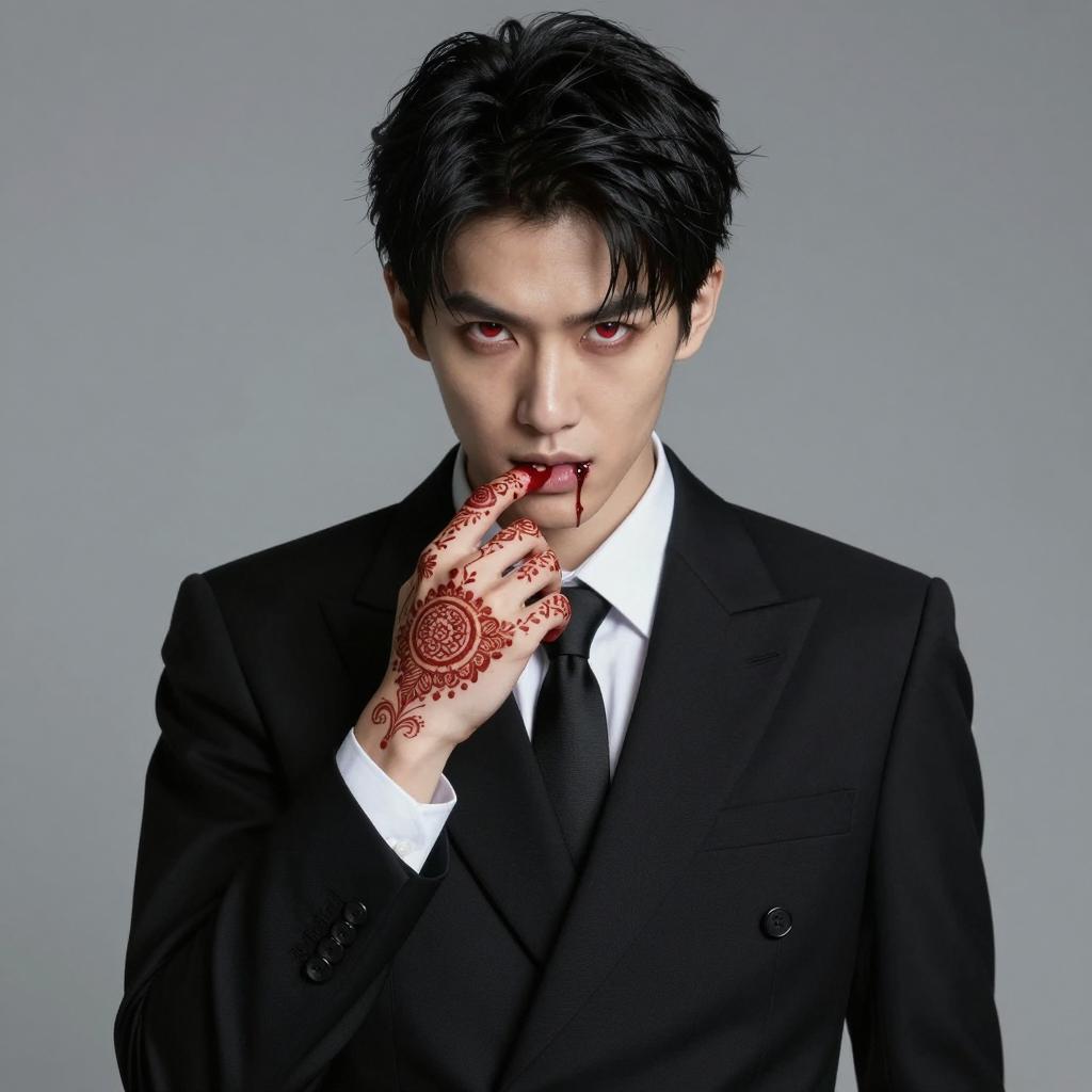 Portrait of an Asian man with black hair and pale skin wearing a black double-breasted suit and black tie. He has intricate red henna designs on his right hand, which he is biting, causing red blood to drip. The man's eyes are red, and he has an intense gaze. The background is plain gray.