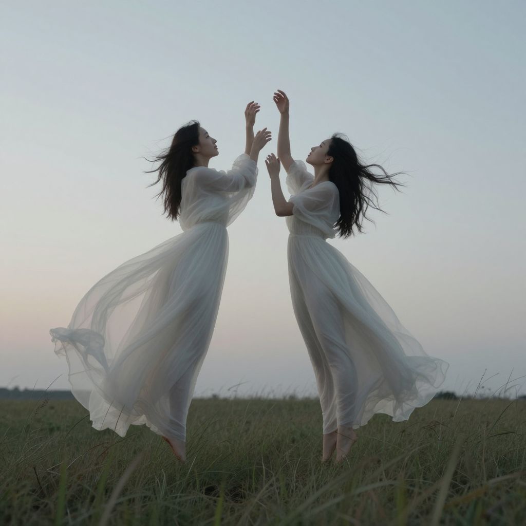Photograph of two women with long, dark hair, standing in an open field at dusk. They are dressed in flowing, translucent white dresses that billow in the wind. Both women are jumping and raising their arms towards each other, creating a sense of dynamic movement and connection. The background features a clear, pale blue sky and tall grasses. The image has a soft, ethereal quality with a gentle gradient of light, emphasizing the women's silhouettes and the delicate fabric of their dresses.