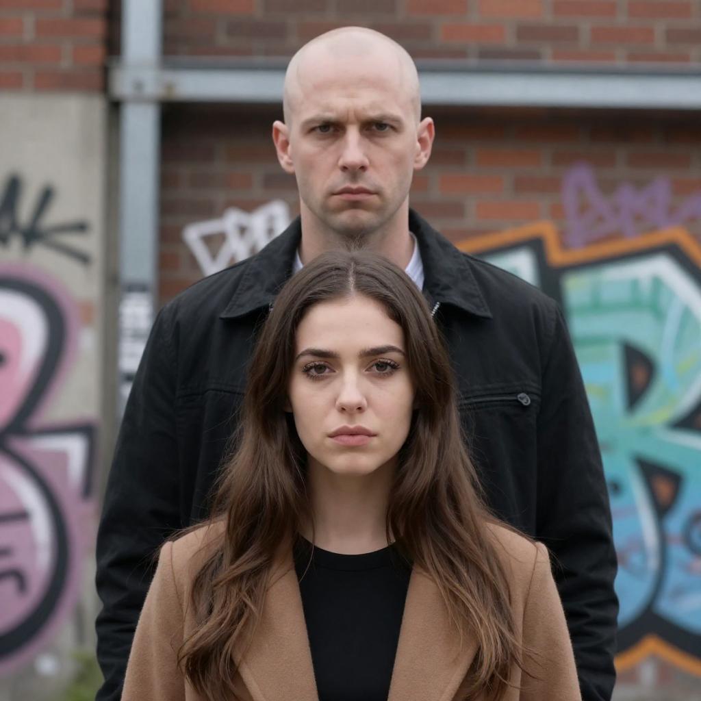 Large moth with vibrant orange and black wings, skull-like head, black background. Two people below: bald man in white shirt, serious expression; woman with brown hair, brown jacket, neutral expression. Moth wings spread wide, centered.