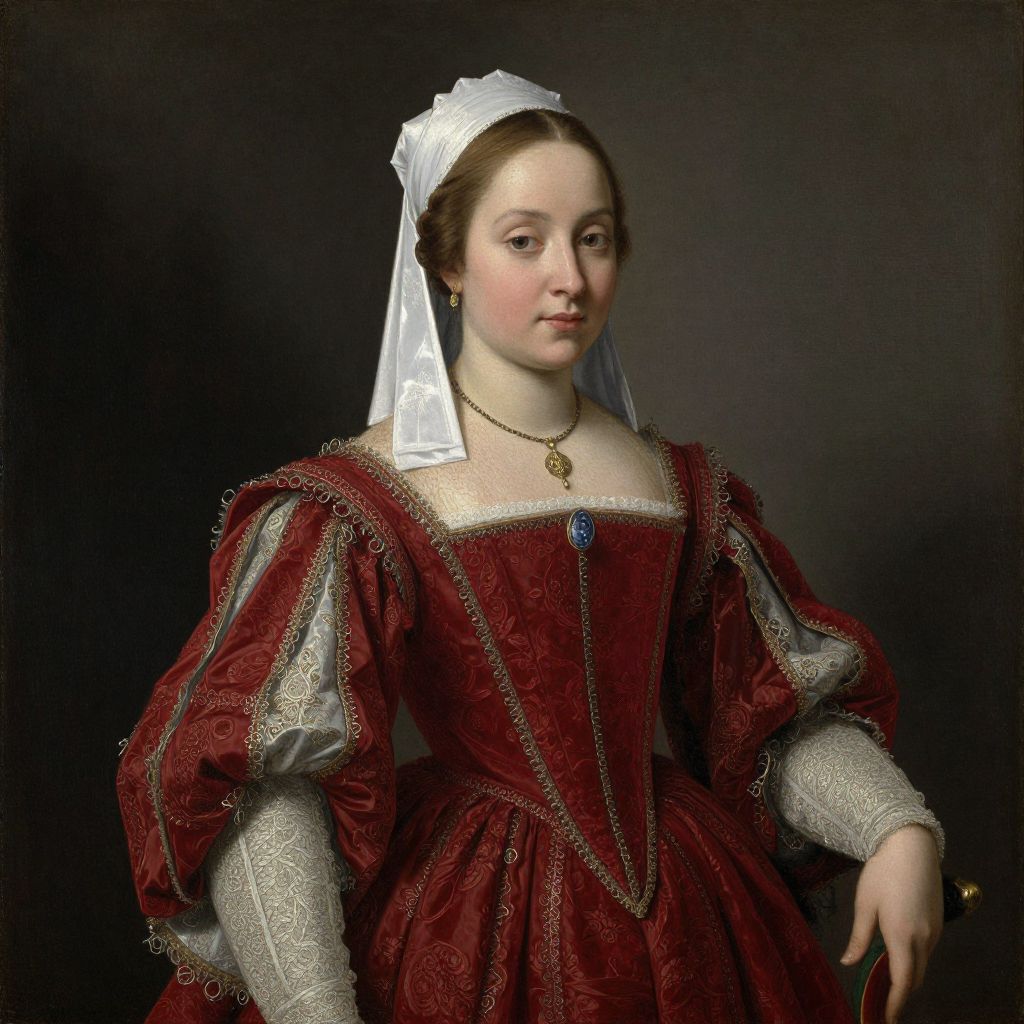 17th-century portrait of a young woman in a rich, red, embroidered gown with puffed sleeves, white headdress, and blue gem necklace,