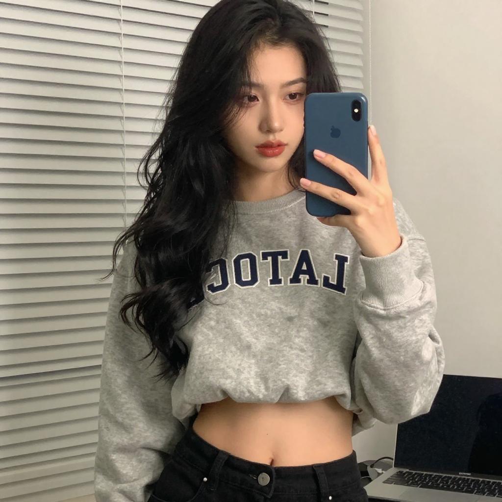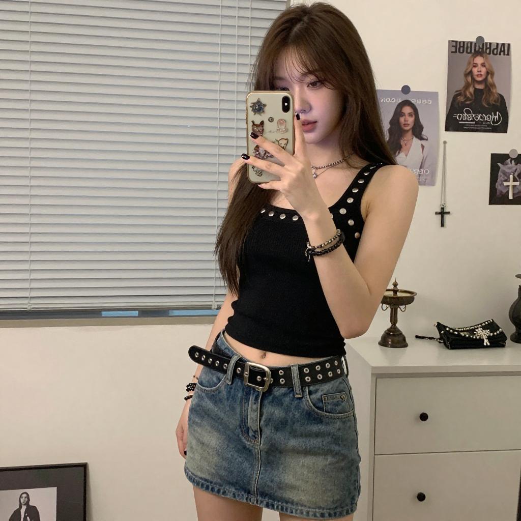 Photograph of a young woman with long black hair, wearing a black crop top with red plaid sleeves, and a black jacket. She has tattooed hands and is holding a phone with a Pikachu sticker. She stands in an urban, graffiti-covered room, taking a mirror selfie. Her expression is neutral, and she wears blue jeans with a black belt.
