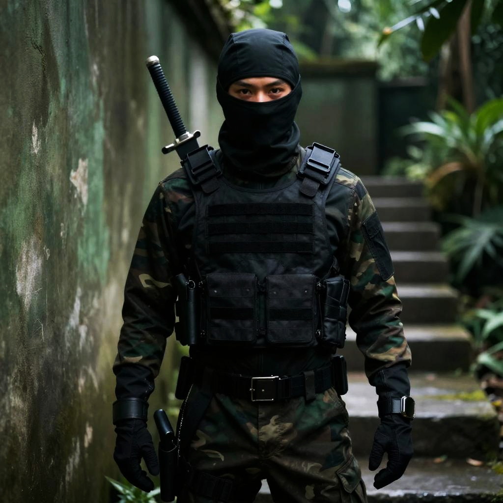Photograph of a dark, intense scene with six heavily armed, black-clad men in tactical gear. One stands dominant in the center, pointing a gun, while the others are either lying on the ground or crouching. The dimly lit background features a shadowy, industrial setting. The men wear helmets and have serious, focused expressions.