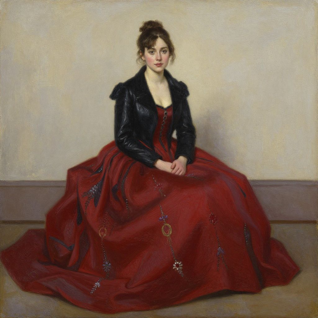 Photorealistic painting of a pale-skinned woman with dark hair in an updo, wearing a red, ornate dress and black jacket, seated