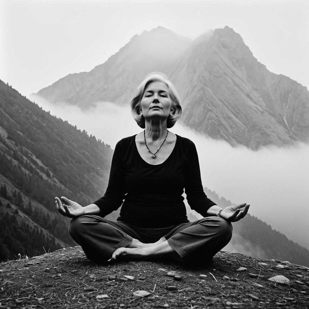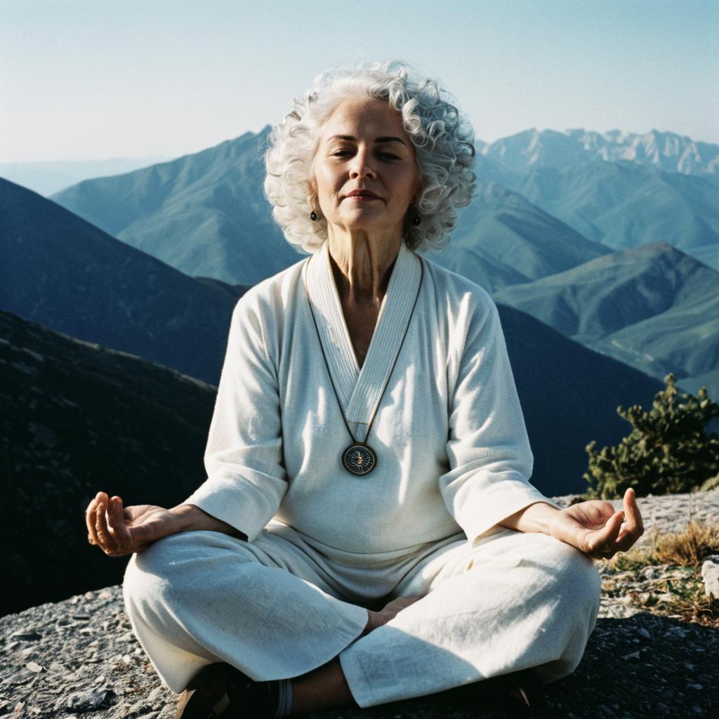 Portrait of an elderly Caucasian woman with white curly hair meditating in a cross-legged position on a mountain top. She is wearing a light-colored long-sleeve shirt and dark pants, seated peacefully with her eyes closed against a backdrop of rugged, green mountains under a blue sky with scattered clouds.