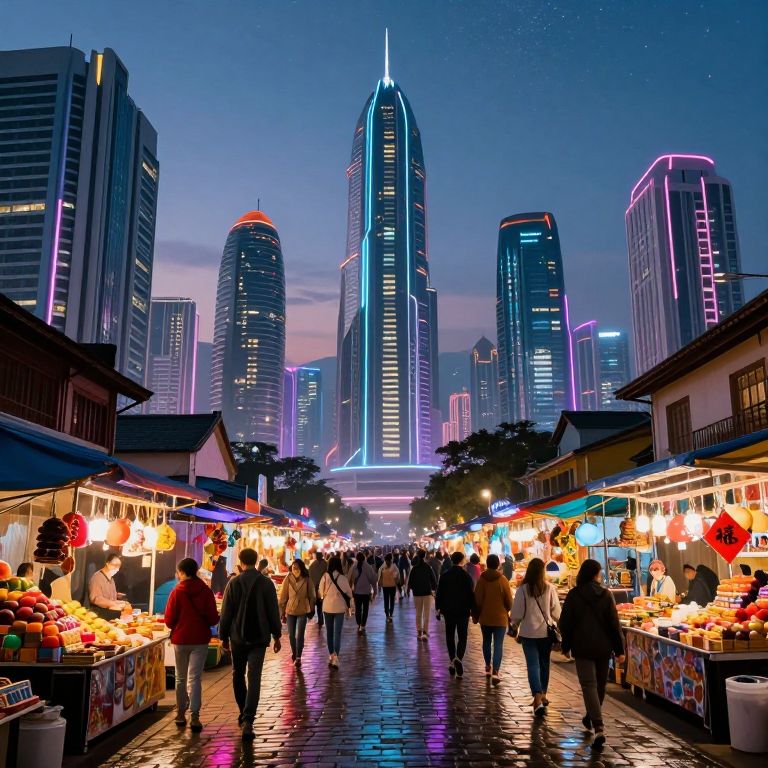 Purrah, futuristic cityscape blending ultra-modern skyscrapers and traditional architecture, neon lights reflecting on wet cobblestones, bustling market with colorful stalls and diverse crowds, dusk sky with glowing stars, dynamic and lively
