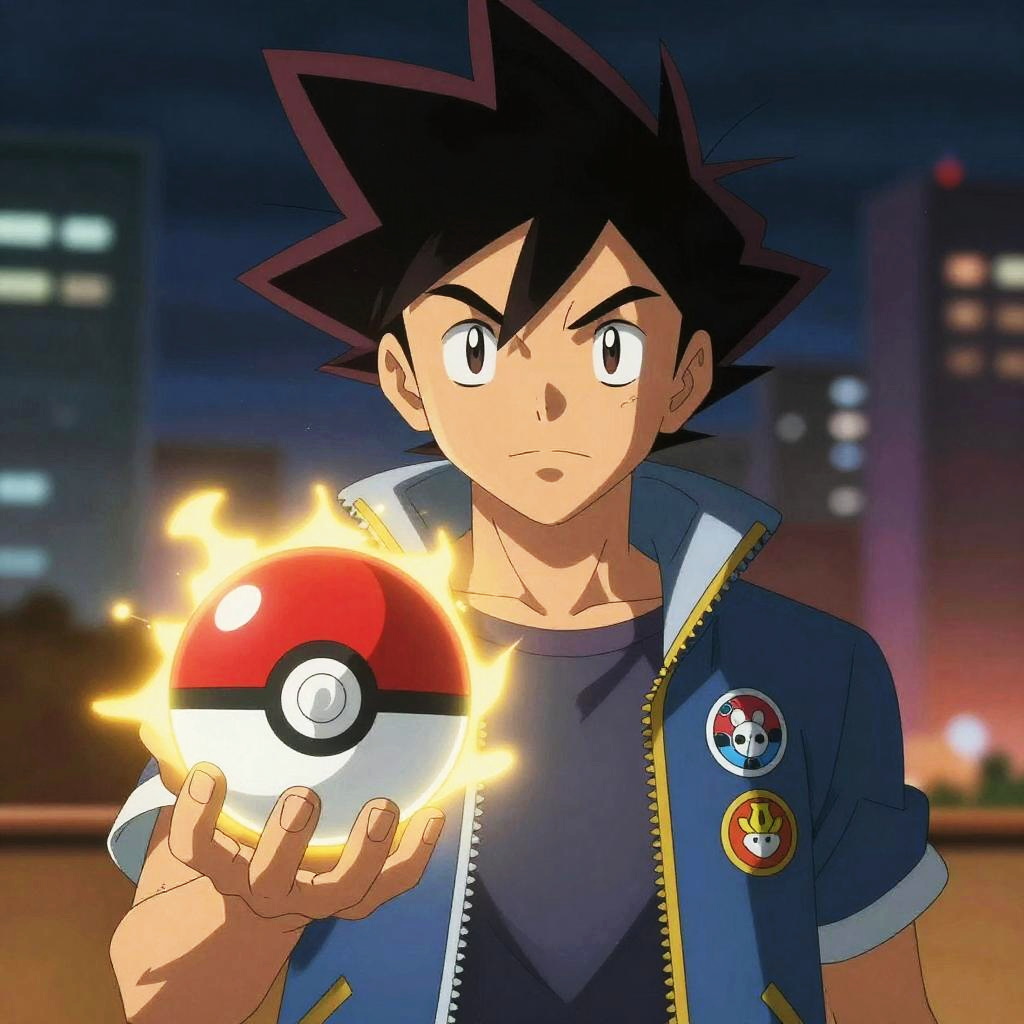 Pokemon trainer pfp, close-up digital painting of a focused male trainer with spiky hair and a jacket full of badges, glowing aura around pokeball in his hand, detailed facial expression with anime art style, dramatic lighting, blurred cityscape background