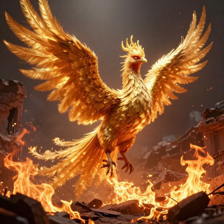 Visualize an alluring digital composition showcasing the captivating instant when a regal phoenix rises from its blazing ruins, as viewed from an unconventional \"worm's-eye perspective.\" The artwork should highlight the minute details of the phoenix's gleaming golden plumage and luminous eyes, juxtaposed with the sharp contrast between the fervent flames and the serene garden it emerges into. This transcendent fusion of renewal and tranquility is portrayed in a hyper-realistic manner akin to surreal dreamscapes, creating an emotional spectrum that harmonizes devastation and rebirth with a hint of mystique and awe.