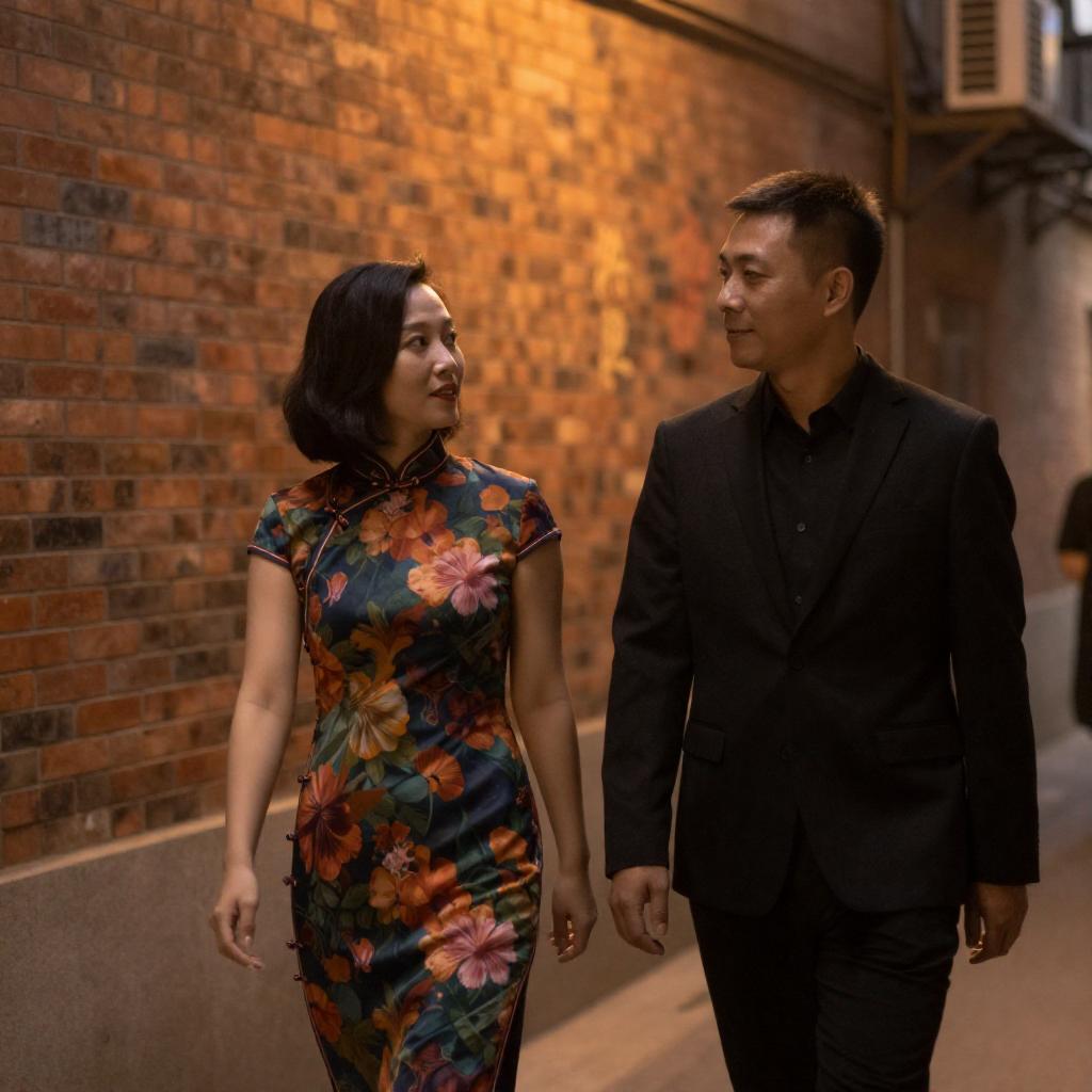 Photograph of an Asian couple walking in a dimly lit, urban alley. The woman, with short black hair, wears a colorful, floral-patterned cheongsam. The man, in a black suit, looks at her. Warm, orange-toned lighting highlights the ured brick wall adorned with Chinese characters in the background.