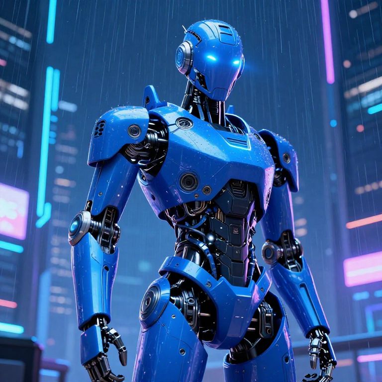 Bluethebot futuristic robot with sleek blue metallic armor, glowing LED eyes, standing in a neon-lit cyberpunk cityscape at night, intricate mechanical details, high-tech atmosphere, digital rain falling, vibrant blue color palette