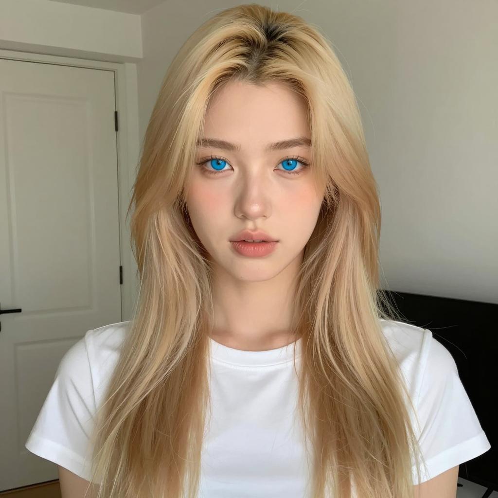 Close-up portrait of a young woman with purple hair and green eyes standing on a busy urban street with illuminated shop signs in the background during dusk. She is wearing a black jacket and a gold heart-shaped necklace, with a neutral expression on her face.