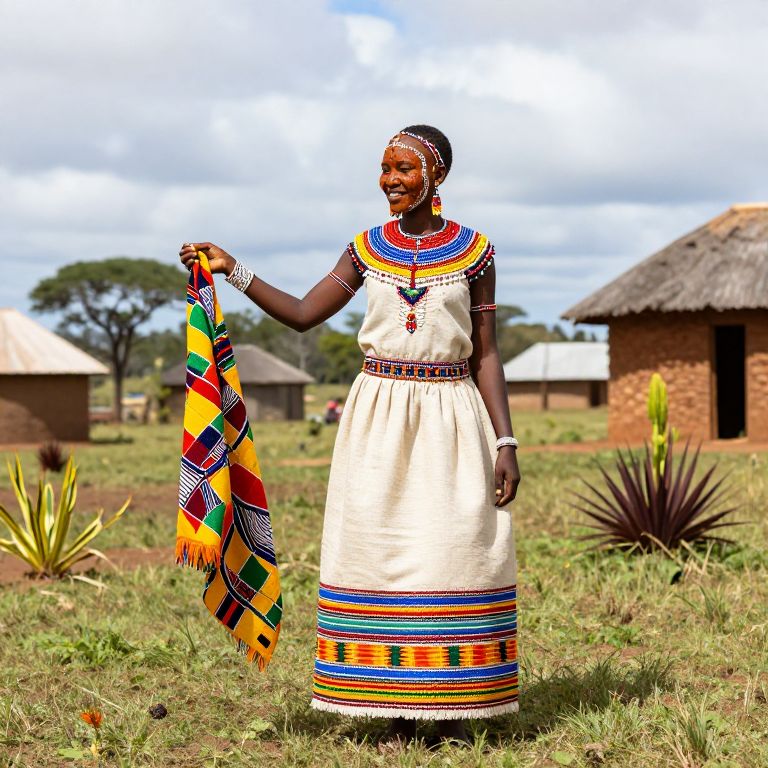 A detailed, realistic photograph of a South African Xhosa bride in a traditional bridal gown made of handwoven cotton and colorful beadwork, standing in a grassy village compound under a wide sky, her face painted with natural ochre and intricate bead patterns, holding a hand-painted kente cloth as she smiles with pride, the setting rich with cultural details and local plants around her.