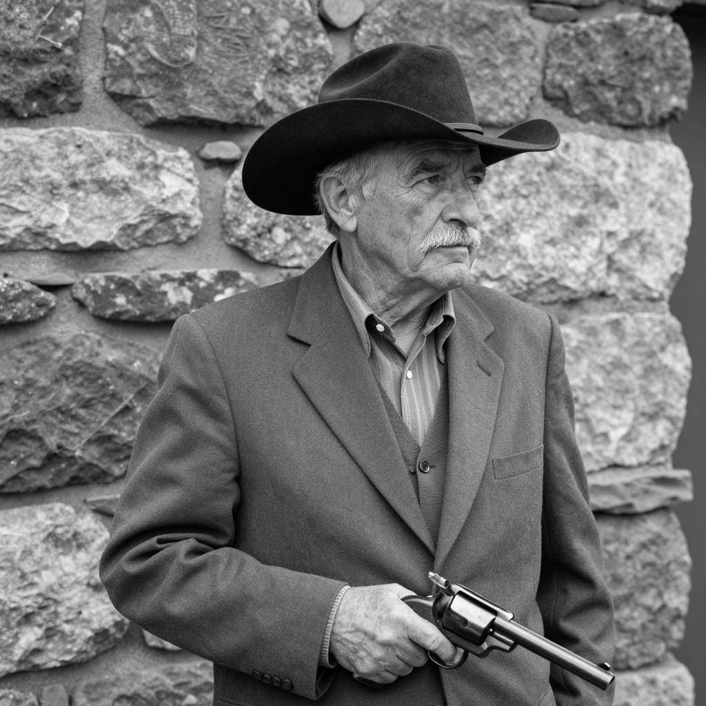 Portrait of a middle-aged man wearing a brown wide-brimmed hat, a dark leather jacket with red and gold embroidery, and a white shirt. He holds a black revolver in his right hand and smiles while looking to the right. The background features trees and shrubs in an outdoor daytime setting.