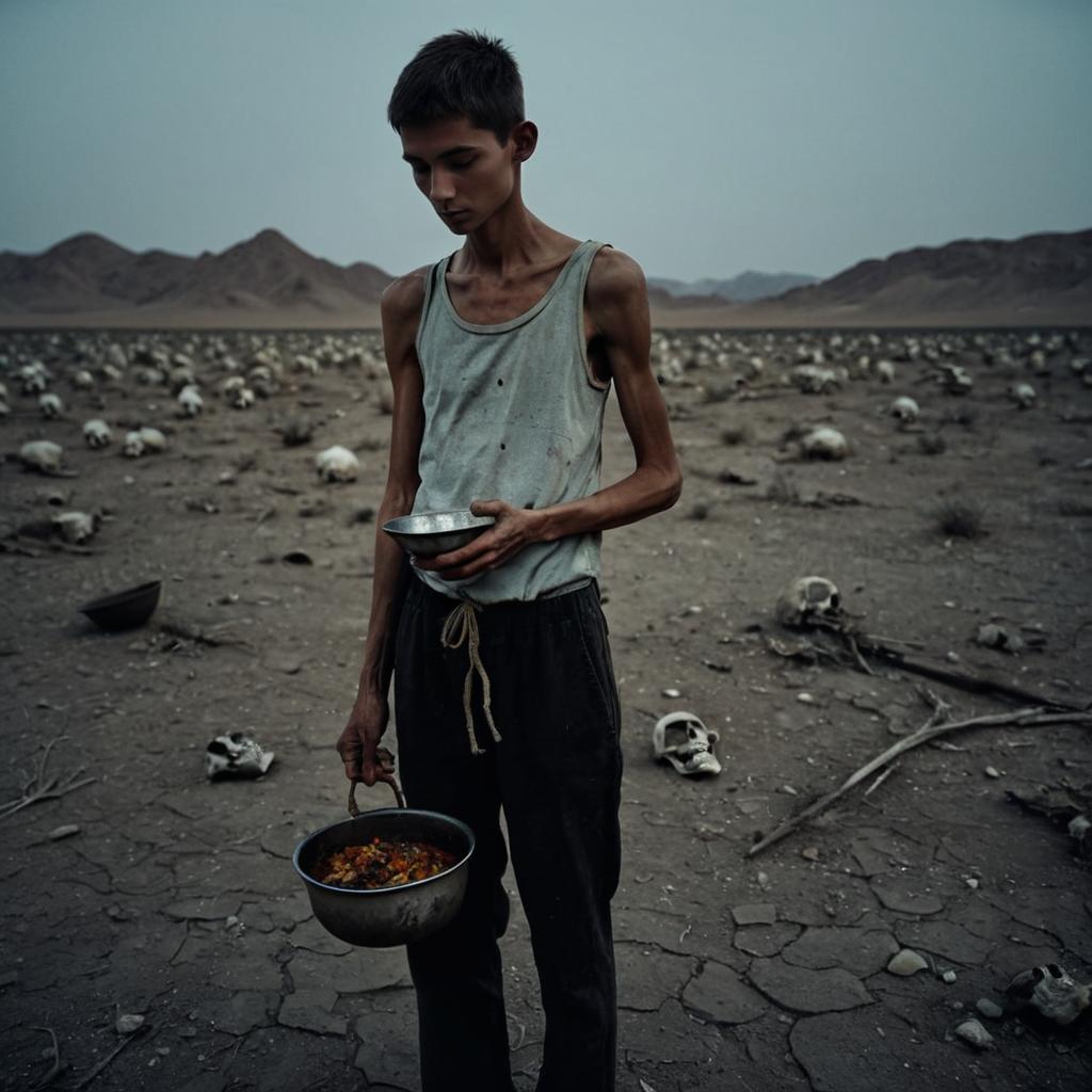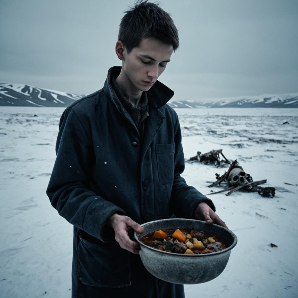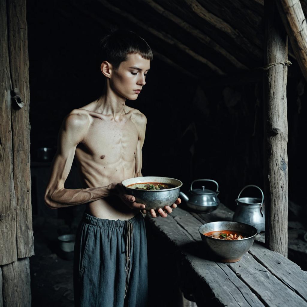 Resin Sticker photo of a very skinny young prisoner, gaunt and pale, narrow face, sad eyes, standing in a cold prison yard, holding bowl of stew raised half way up ready to drink, near a large pot cooking a dead body and bones, wide shot, side view, gloomy lighting, 4k,