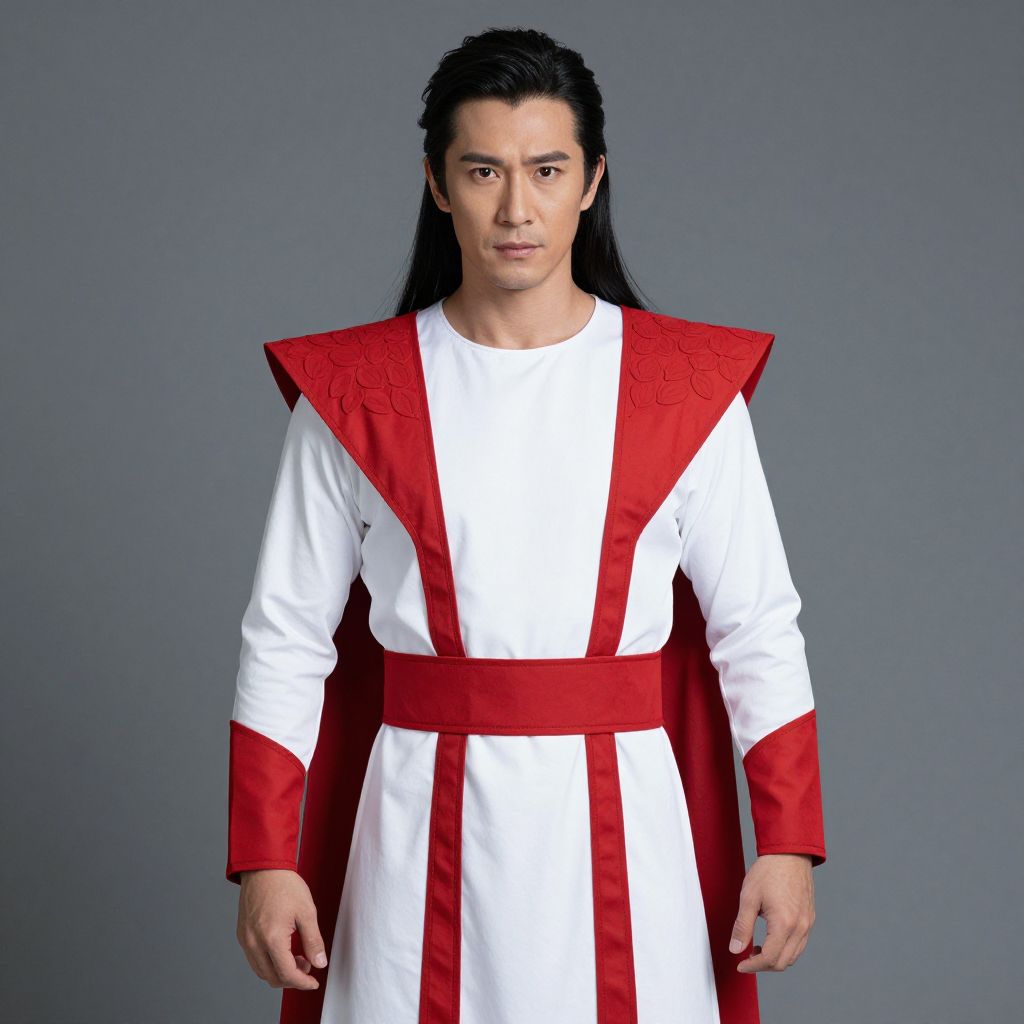 Photograph of an Asian man with long black hair, wearing a white and red medieval-style tunic with red shoulder pads and belt, standing against a