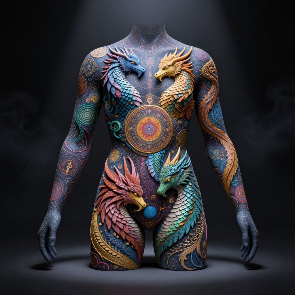 Full body art depicting mythological creatures intertwined on a human canvas, with detailed scales, feathers, and mystical symbols in vibrant colors, showcased in a dramatic spotlight against a dark, smoky background.